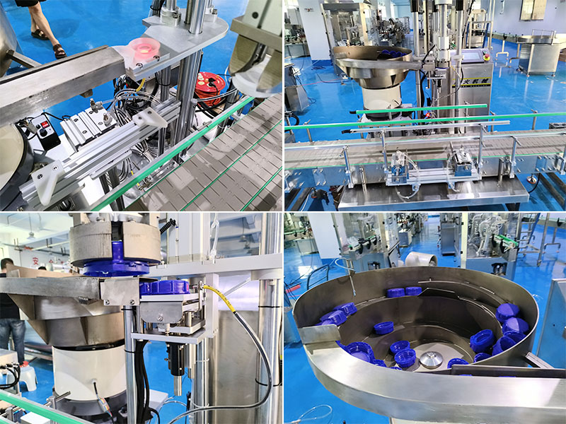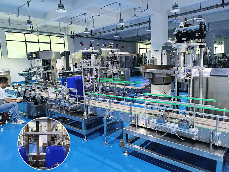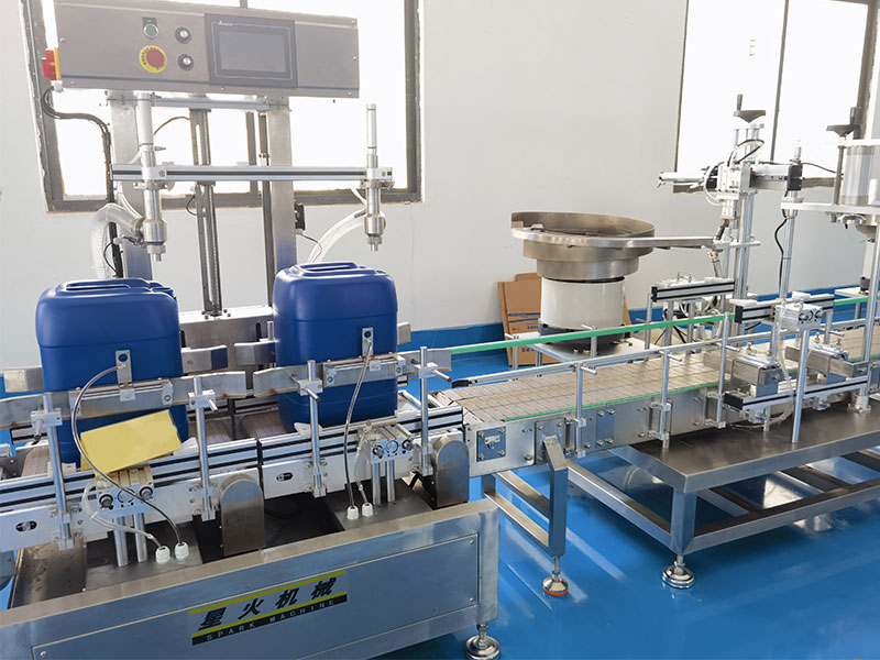25kg化工液體稱重灌裝機自動輸送→定位(wèi)→檢重→灌裝→稱重→上蓋→旋蓋→貼標→成品輸出。