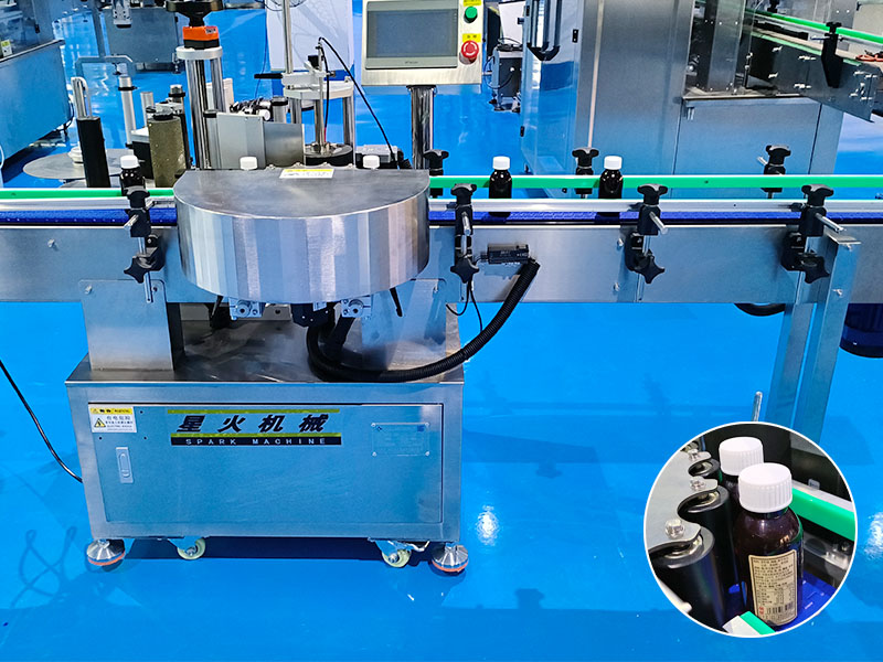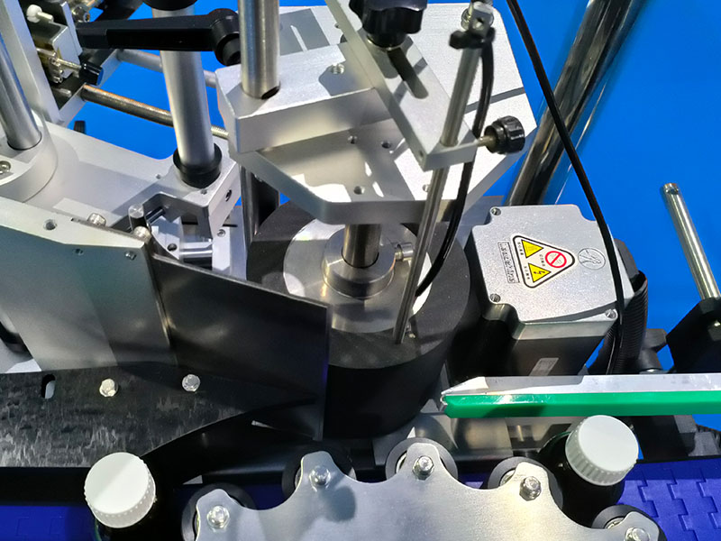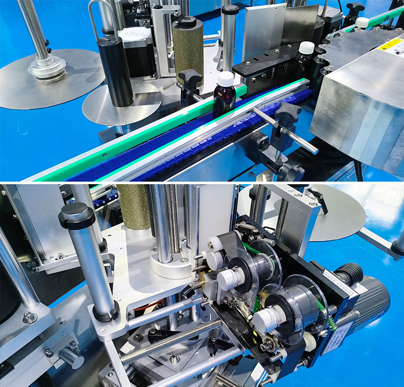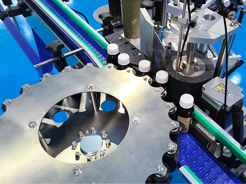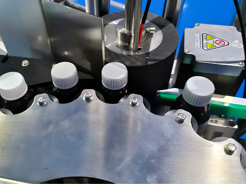 小型星盤自動貼標機核心部分為星(xīng)盤式轉盤結構,配合供(gòng)標係統、貼標係統、控製軟件的協(xié)同作業,能夠快速將產品貼上商家生產信息,使其產品(pǐn)更有辨識度。當產品通過輸送(sòng)帶送至小型星盤自動貼標機的轉盤工位時,星盤上(shàng)的定位夾(jiá)具會精準的抓取商品並進行固定。它(tā)的貼標頭是由氣缸(gāng)或伺服(fú)電機的帶動下,能夠快速、精準的將(jiāng)標簽貼在產品表麵。對於市麵(miàn)上比較常見的(de)飲料瓶、藥品、化妝品、噴霧劑(jì)、漱口水等圓形瓶子都(dōu)能夠執(zhí)行穩定的貼標動(dòng)作。